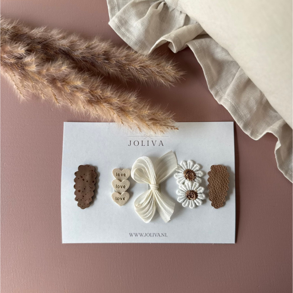 Dit lieve haarsetje bestaat uit vijf haarspeldjes met de fijnste anti-slip clipjes, speciaal gemaakt voor de allereerste, dunne haartjes. Al vanaf baby kunnen deze speldjes gedragen worden – ze blijven stevig zitten en glijden niet uit het haar.