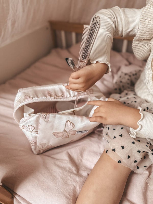 In deze bag vind je een gepersonaliseerde borstel met naam, handspiegel, vernevelaar, elastiekmesje, puntkam, vlechttool, mini borstel en een haarlus set – allemaal in de zachte kleur roze.